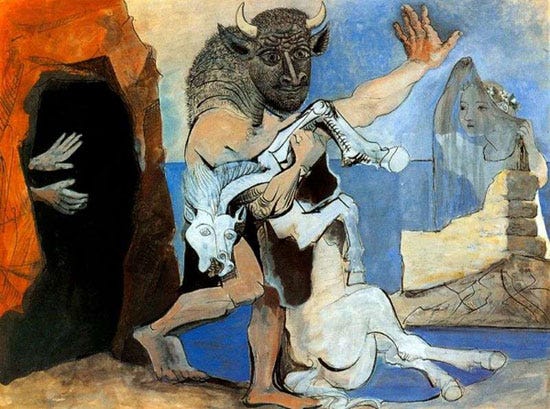 The MINOTAUR, as the ancient matriarchal cults and enlightened moderns like Picasso knew only too well, is the irreducible part of what is being mortally ENDANGERED in the modern era.